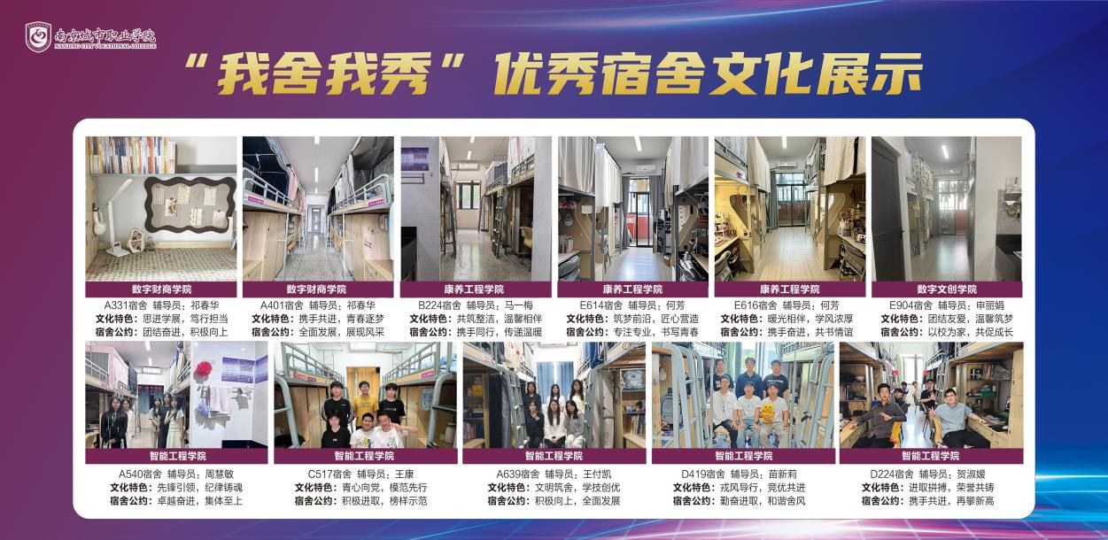 “我舍我秀”宿舍文化展示周中,一批优秀宿舍脱颖而出。既有全员荣获奖学金、热衷科研创新的“学霸寝室”,也有党员、入党积极分子发挥先锋模范作用的“红色寝室”,更有退役复学学生传承军旅精神的“硬核寝室”。通过展板展示、视频分享等形式,各宿舍将独特的文化内涵与精神风貌娓娓道来,生动诠释了团结友爱、积极向上的宿舍文化内核,成为学生身边可学可鉴的鲜活范本。