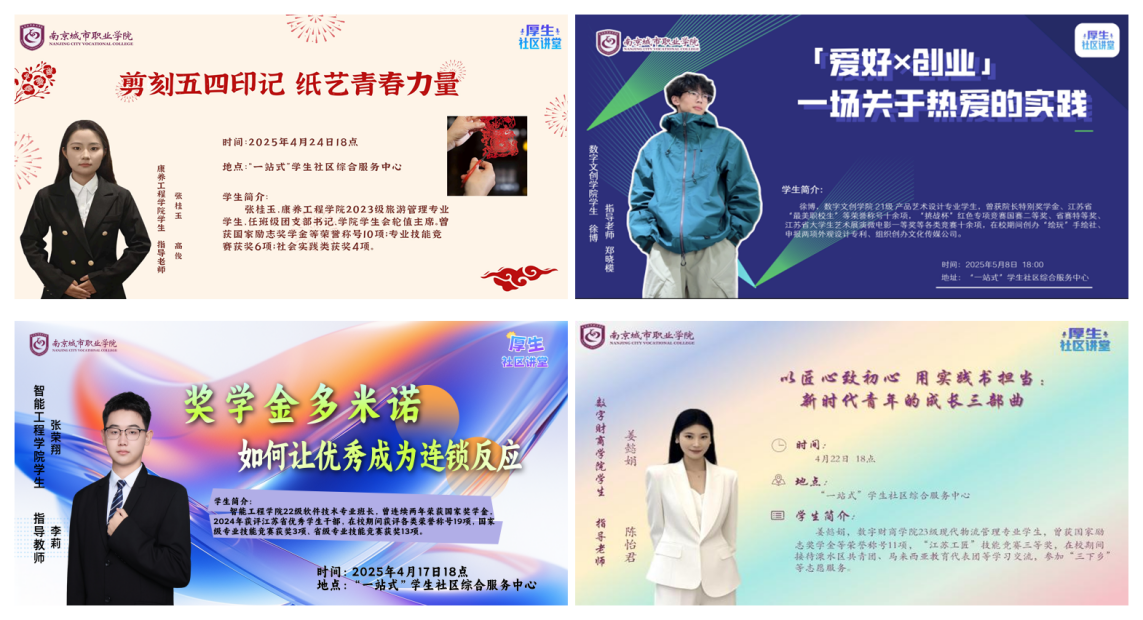 “厚生”社区讲堂在文化节期间开设“朋辈分享”板块,四位优秀学子围绕学业提升、竞赛经验、精神传承与职业规划带来专题讲座。他们结合自身经历,分享从学业竞赛到社团实践的成长路径,深度剖析新时代青年发展方向,以榜样力量激发学生奋进动力。讲座现场互动热烈,不少学生表示:“学长学姐的经验分享让我对大学生活有了更清晰的规划,也看到了奋斗的方向。”系列讲座在社区内掀起学习热潮,营造出浓厚的比学赶超氛围。
