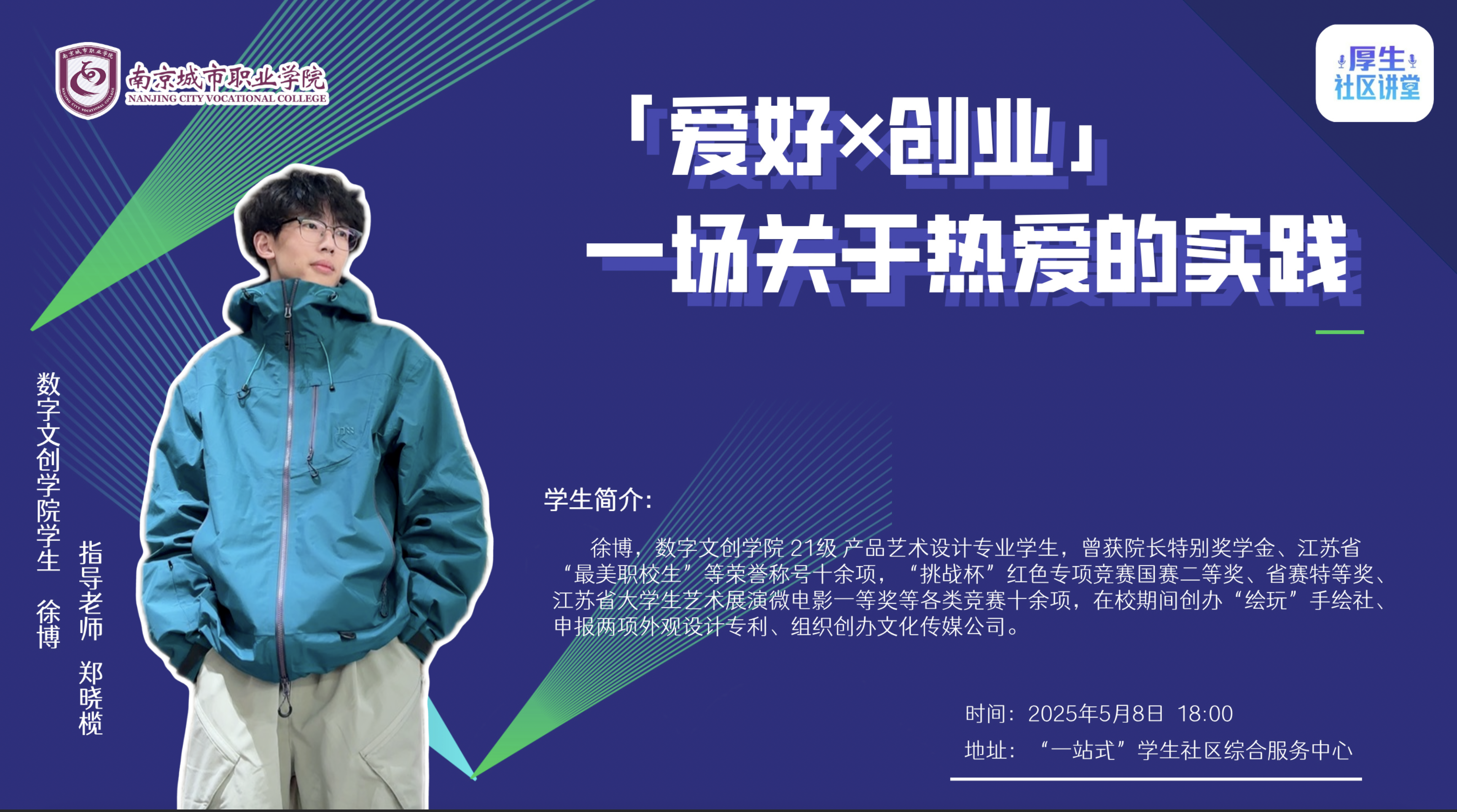 讲堂第十八讲:数学文创学院毕业生徐博的“朋辈分享”,以“爱好X创业:一场关于热爱的实践”为讲座主题。徐博同学成绩优异,获奖众多,拥有丰富的校园经历,创办手绘社、申报专利并参与创办文化传媒公司。他结合自身经历,分享在文创设计、视频拍摄制作、公众号运营等方面的实践经验,展示“城小弟”“团小城”等文创作品及周边产品。他还谈到将爱好转化为工作的感悟,提醒同学们理性看待职业规划。鉴于当前就业形势严峻,他建议同学们依据兴趣寻找喜欢且擅长的方向,尽早努力,并利用互联网学习新媒体知识提升竞争力。
