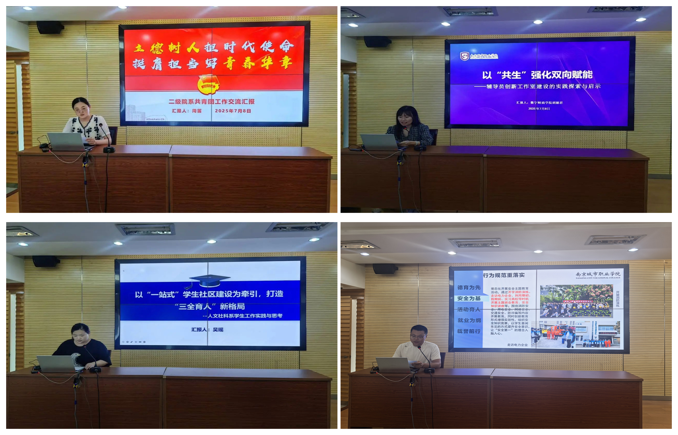 培训伊始,便构建起校际间高效务实的交流平台。南京机电职业技术学院自动化工程系辅导员周笛分享了创新团学工作的实践路径与深度思考;人文社科系辅导员吴瑶系统介绍了院系学生工作体系,重点围绕思想价值引领、精细化宿舍管理及劳动育人等方面交流特色经验。我校智能工程学院辅导员王付凯从“德育为先、安全为基、活动育人、就业为纲、载誉前行”五大维度,全面展示学院学生工作的育人成果;数字财商学院辅导员胡丽君聚焦“辅导员创新工作室”建设,分享宝贵的实践探索与模式启示,为学生工作的深化拓展提供崭新视角。我校学生处处长严翔与南京机电职业技术学院学生工作处处长张宝中,分别就两校如何深入践行“三全育人”理念开展学生工作、协同构建全方位学生综合素质培育体系进行专题汇报。